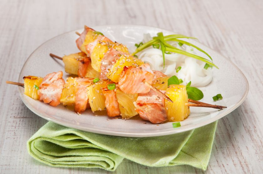 Ananasą supjaustykite vidutinio dydžio kubeliais, taip pat supjaustykite ir lašišos filė. Sudėliokite iešmelius pakaitomis iš ananaso ir lašišos gabalėlių ir padėkite į lėkštę.