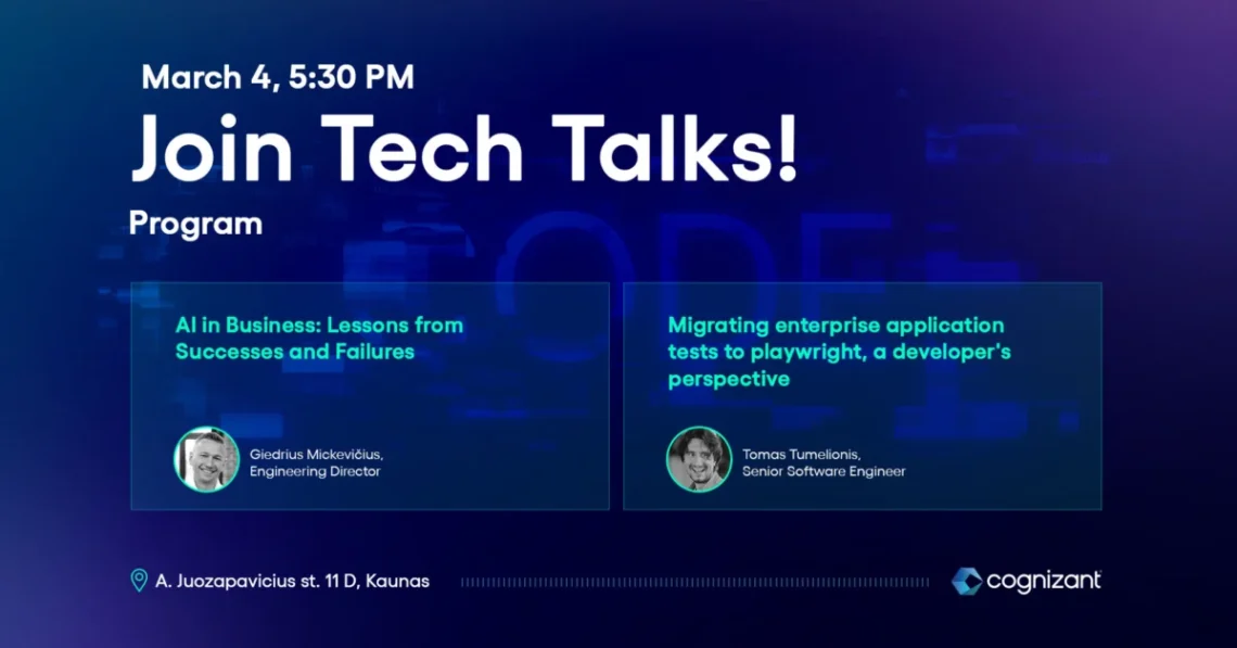 Įžvalgomis apie tai, kokiais esminiais principais vadovautis, norint sukurti sėkmingus Dirbtiniu intelektu, ir ne tik, paremtus IT produktus renginiuose dalysis „Cognizant“ padalinio vadovas Giedrius Mickevičius bei ilgametę patirtį turintis įmonės vyresnysis programuotojas Tomas Tumelionis.