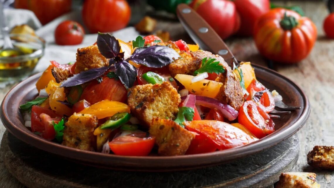 Maisto technologai kviečia išmėginti tradicinių itališkų pigių salotų „Panzanella“ su nektarinais receptą, idealiai tiksiančių vėlyviesiems vasaros pietums.