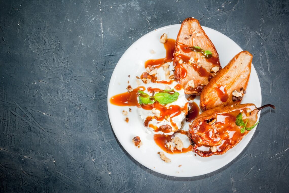 Keptos kriaušės su ledais, pagardintos medumi ir pipirais